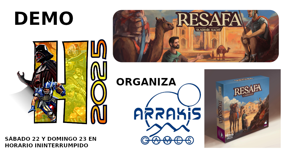Resafa tiene lugar durante el siglo III d.C. en la zona del actual Oriente Medio. Resafa ahora está en ruinas en la actual Siria, pero en aquella época era un puesto fortificado en el desierto que floreció como parada en importantes rutas de caravanas. En el juego, los jugadores representan a comerciantes que realizan viajes de negocios y compran y venden productos en las distintas ciudades de la región. Resafa no tenía fuentes locales de agua, por lo que dependía en gran medida de grandes cisternas para recoger el agua de lluvia de primavera e invierno y hacer habitable la zona. Los jugadores construyen tanques de agua y canales para distribuir ese agua donde sea necesaria. En las ciudades construyen talleres para ayudar a que sus negocios crezcan, lo que les permitirá recolectar recursos y camellos. También construyen jardines entre sus negocios, generando más recursos y también puntos de victoria. La partida dura seis rondas. En cada ronda, un jugador realiza sólo tres acciones, jugando cartas de acción en este juego intenso y emocionante.